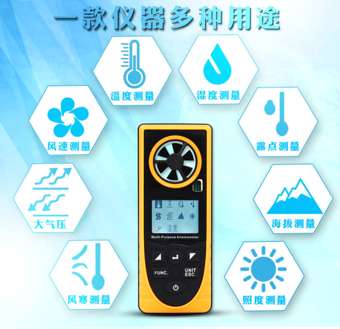 本產(chǎn)品是一款本便攜式多功能氣象儀,適用于測(cè)量溫度、濕度、風(fēng)寒、露點(diǎn)、風(fēng)速、大氣壓、海拔、照度。