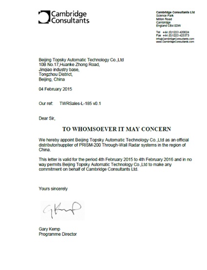 2015年2月4日,北京凌天正式成為英國(guó)劍橋cambridgeconsultants公司PRISM200穿墻雷達(dá)在中國(guó)的總代理