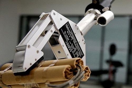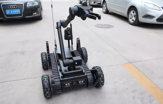 機械臂部分配備爆炸物銷毀器、瞄準(zhǔn)器,能現(xiàn)場對爆炸物進行摧毀;
