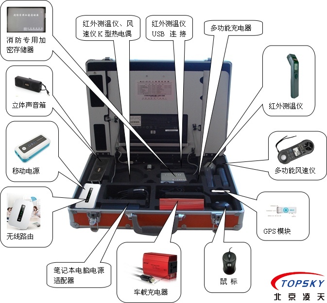 整套設(shè)備包括:筆記本電腦、紅外測溫儀、多功能風(fēng)速儀、GPS模塊、消防專用加密存儲(chǔ)器、立體聲音箱、無線路由器、電源系統(tǒng)、鼠標(biāo)、車載充電器、移動(dòng)電源、筆記本電腦適配器、便攜箱、防水迷彩袋;