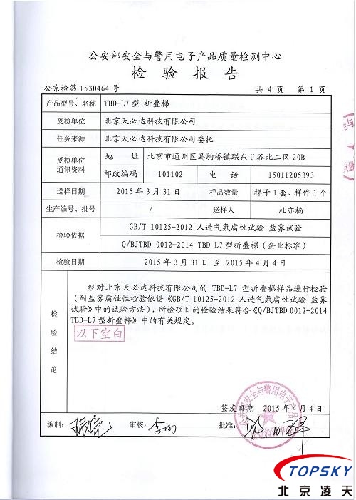 此款折疊梯是由鋁合金材料制成的,連接銷為不銹鋼,操作極為簡便且使用安全可靠。相比于傳統(tǒng)的梯子,它的主要特點是重量輕,折疊后體積小,可以放在一個小箱子內(nèi),攜帶方便,適用于處理各種緊急情況;例如人質(zhì)救援,包圍犯罪分子,也可以用于水上救援時做跳板用。 本產(chǎn)品通過公安部安全與電子產(chǎn)品檢測檢驗中心檢測,檢測報告編號:公京檢第1530464號。