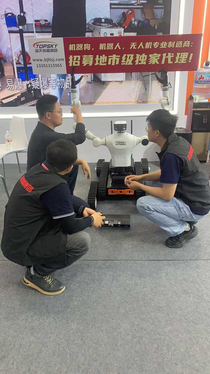 雙臂排爆機(jī)器人主要是用來處理爆炸物相關(guān)工作的排爆式機(jī)器人,也可用于偵察人難以達(dá)到的地形的一種機(jī)器人。同時(shí)該裝備采用擬人機(jī)械臂結(jié)構(gòu)兼容人體姿態(tài)隨動(dòng),手持控制,便攜控制箱等多種人機(jī)交互操控方式,可實(shí)現(xiàn)雙臂協(xié)同靈巧操作、雙向語音通話、高清立體視頻及回傳反饋等功能。履帶式底盤,極大提升越障和爬坡能力,可適應(yīng)沙地、瓦礫、草地等多重復(fù)雜地形。同時(shí)新增的腰部自由度擴(kuò)大了機(jī)器人的工作空間,更加方便機(jī)器人處理地面和高處任務(wù)。能夠在非視距條件下,遠(yuǎn)程操控機(jī)器人打開拉鏈包裹、消防栓、垃圾桶等可疑載體,檢查翻找危險(xiǎn)品及自制炸彈;能夠攜帶并使用柔性防爆罐,在非視距條件下,遠(yuǎn)程操控機(jī)器人完成從爆炸物抓取、轉(zhuǎn)移、放置于排爆罐內(nèi)、關(guān)閉排爆罐的全流程作業(yè)。