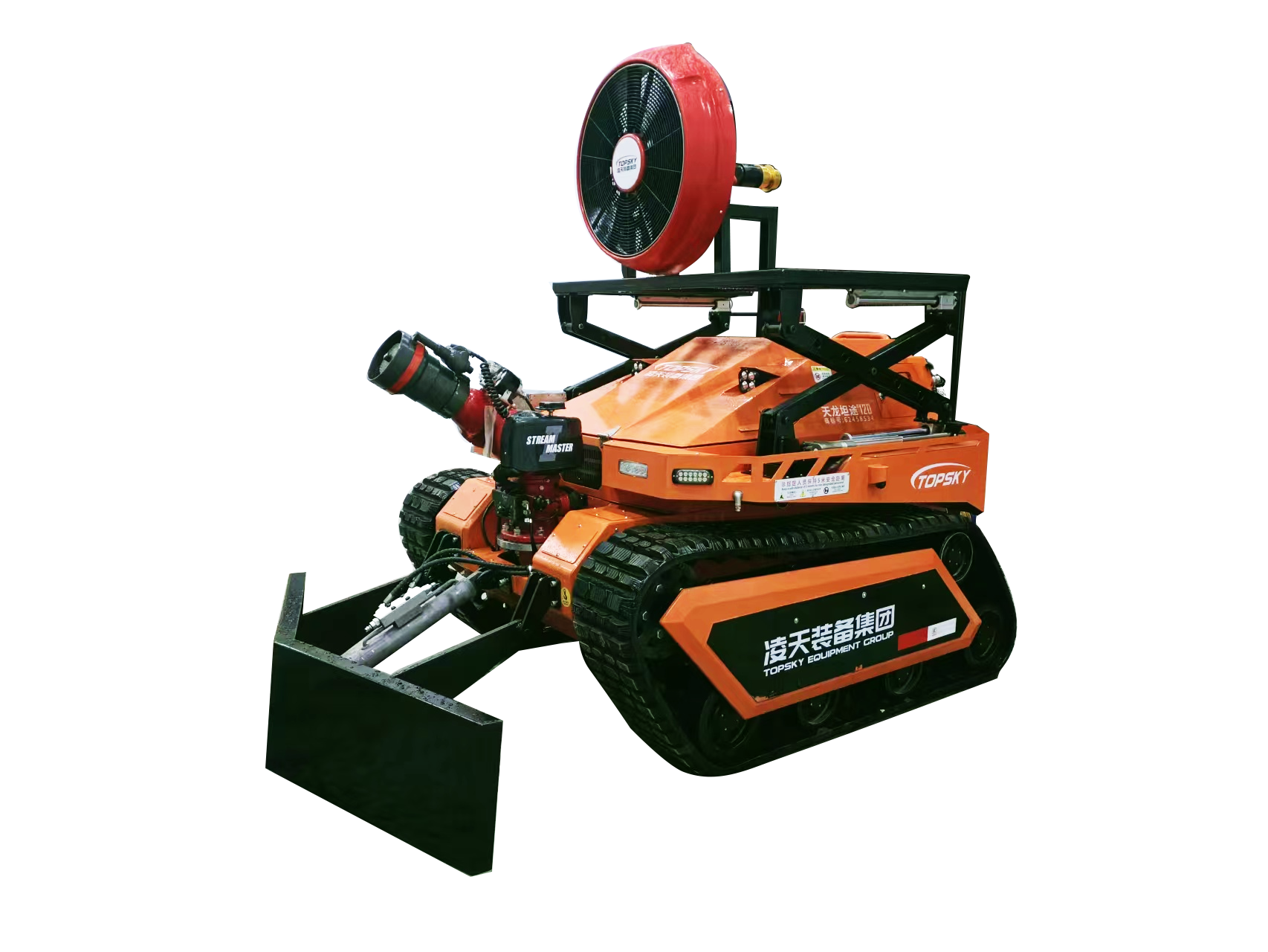 消防排煙滅火機(jī)器人是一款履帶式中型油動(dòng)力消防滅火機(jī)器人,采用柴油發(fā)動(dòng)機(jī)為動(dòng)力,閉式液壓系統(tǒng)驅(qū)動(dòng)ASV橡膠履帶進(jìn)行高速行走,搭載了每秒120升的大流量消防炮,具有60000m3/h的可升降大流量水力排煙機(jī),及V型推鏟,攜帶多種檢測(cè)、監(jiān)控傳感檢測(cè)裝置,對(duì)火災(zāi)場(chǎng)所實(shí)施遠(yuǎn)程實(shí)時(shí)監(jiān)控,進(jìn)行火災(zāi)撲滅、煙霧及有毒有害氣體驅(qū)散,道路開(kāi)辟清障。