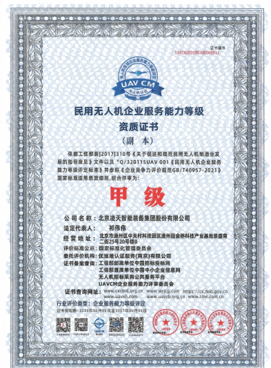 資格類民用無人機(jī)企業(yè)服務(wù)能力等級資質(zhì)證書(甲級)