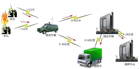 前端人員背負(fù)單兵設(shè)備采集音視頻信號傳給移動中繼車,車上的接收合并采集信息后并對接車載(中繼)設(shè)備。由中繼接力發(fā)射 ,從而形成約30公里左右距離的 應(yīng)急通信鏈路,直至指揮中心。