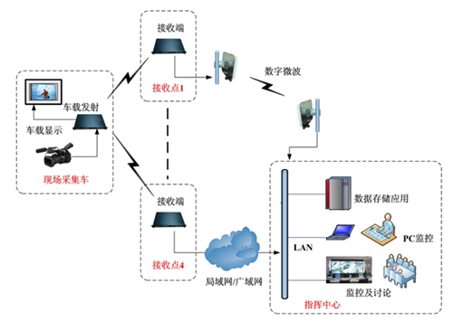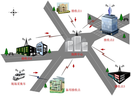 前端現(xiàn)場采集車安裝大功率車載設(shè)備在城市各區(qū)內(nèi)巡邏,實(shí)時(shí)將采集的音視頻信息傳給就近接收點(diǎn),接收點(diǎn)用微波、光纖或?qū)>W(wǎng)等設(shè)施傳輸給指揮中心。